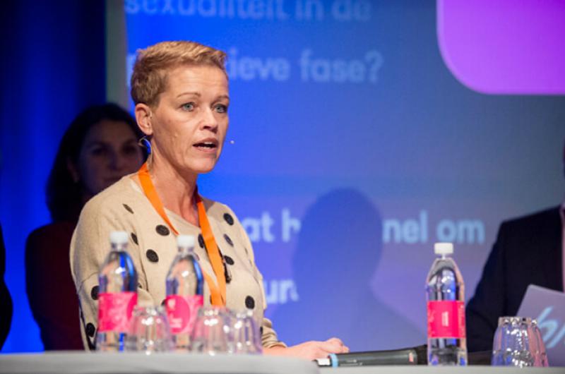 Tijdens een panelgesprek krijgt gynaecoloog-seksuoloog Marga IJlander de vraag wanneer je het onderwerp dan het beste kan aansnijden. ’’Een mogelijk moment is wanneer je praat over behandelingen. Alle behandelingen hebben invloed op de intimiteit en seksualiteit.’’