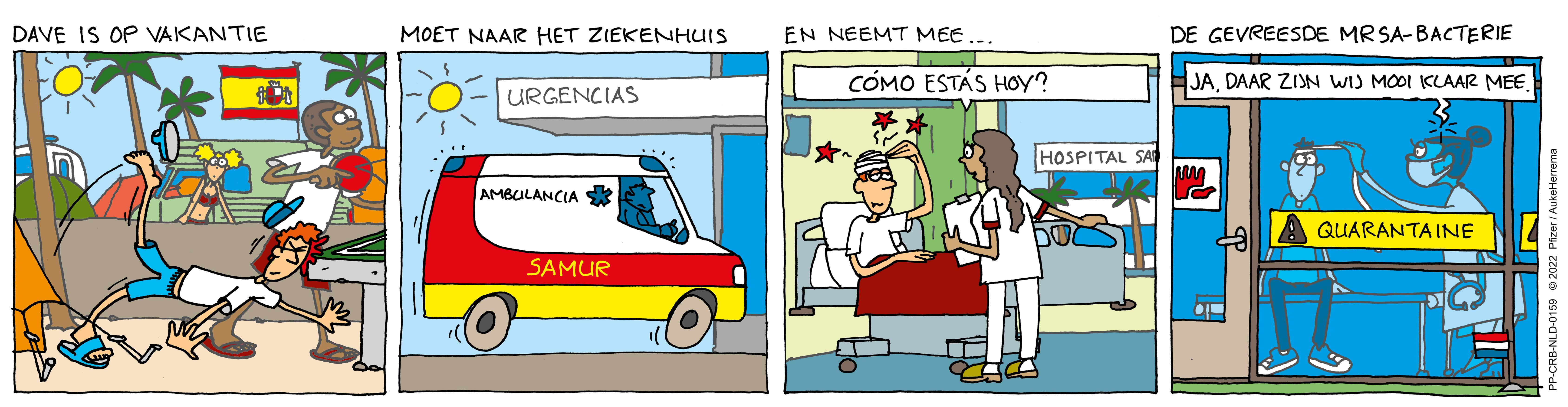 De arts legt Dave uit dat deze vraag voortkomt uit de maatregelen die Nederlandse ziekenhuizen nemen om verspreiding van multiresistente bacteriën te voorkomen. In het buitenland is de kans namelijk groot dat je tijdens een ziekenhuisbezoek zo’n bacterie oppikt en meeneemt naar huis.