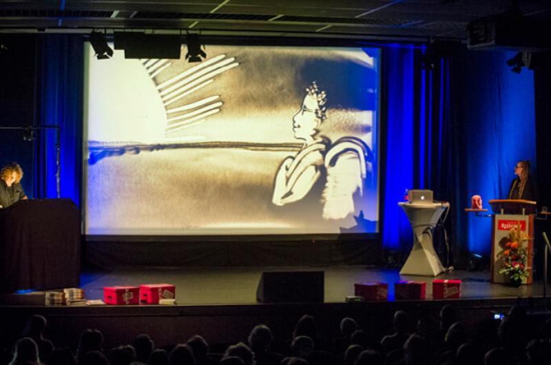 Een oog met een traan, verbonden lichamen en een opkomende zon rijzen uit zandkorrels omhoog. Zandtovenaar Gert van der Vijver verbeeldt het verhaal dat ex-borstkankerpatiënte Kim Gringhuis-Ottens vertelt aan een zaal vol verpleegkundigen tijdens het Roze Olifant-symposium in Ede. Roze Olifant is een programma dat borstkankerteams in ziekenhuizen kan helpen om meer en beter over seksualiteit en intimiteit te praten in de spreekkamer.