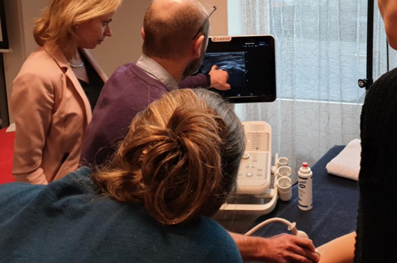 Classey verzorgt met drie collega’s, onder wie ook Carlo Martinoli - universitair hoofddocent van de Universiteit van Genua en de echo-expert bij uitstek - een twee dagen durende workshop voor zorgprofessionals van het Erasmus MC, het Amsterdam UMC, het UMCUtrecht (Van Creveldkliniek), het RadboudUMC, het UMC Groningen en het Máxima Medisch Centrum-Eindhoven over het maken van echo’s van de gewrichten van mensen met hemofilie.