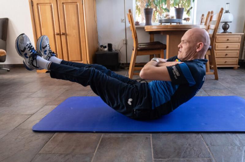 Deze doet hij bijvoorbeeld in zijn badkamer waar beugels hangen en waaraan hij elastieken kan hangen voor de oefeningen. ’’Ook heb ik een skippybal en een mat voor buikspieroefeningen.’’
