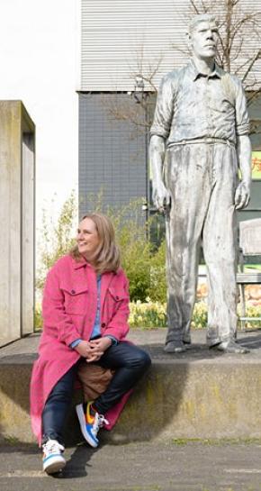 Saskia kijkt op naar het beeld van de ‘Reus van Rotterdam’: het standbeeld van Rigard Rijnhout. Met zijn imposante lengte van 2 meter 38 verdiende hij zijn geld als bezienswaardigheid op de kermis. Hij stierf al op 36-jarige leeftijd aan de gevolgen van acromegalie. ’’Rigard leefde in een tijd dat er nog helemaal geen vroegdiagnoses waren’’, vertelt Saskia. ’’Ik ben blij dat we nu in een tijd leven waarin de medische wetenschap een stuk verder is en mensen niet meer door hun chronische ziekte tot bezienswaardigheid uitgroeien.’’
