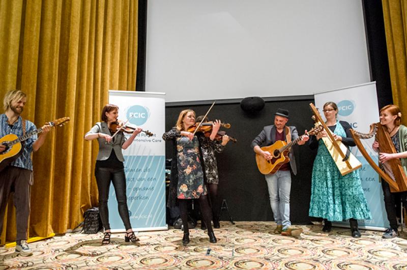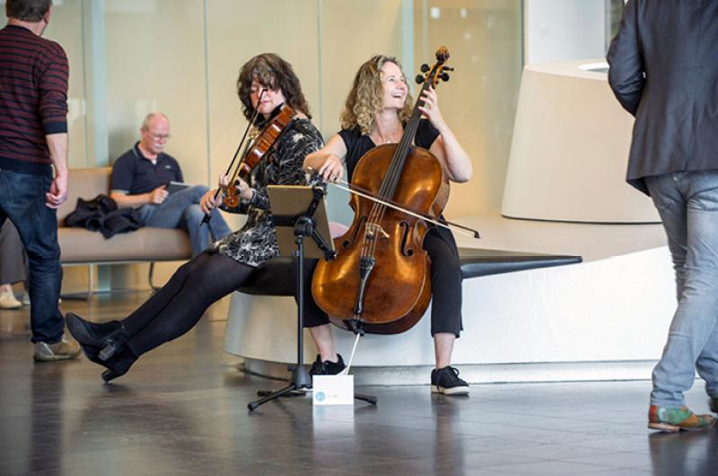 Er staan een violist en een cellist in de hal en verderop staan twee harpistes in de gang om de bezoekers van de informatiebijeenkomst MuzIC, muziek op de IC te verwelkomen met de ontspannen klanken van klassieke muziek die ze normaal op de intensive care ten gehore brengen. Niet alleen bij de bezoekers, maar bij iedereen die langs de muzikanten loopt verschijnt een spontane glimlach op het gezicht.