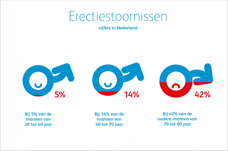 Mannen van elke leeftijd kunnen last krijgen van erectieproblemen. Uit Nederlands onderzoek is gebleken dat 5 procent van de mannen van 20 tot 40 jaar en 14 procent van de mannen van 40 tot 70 jaar erectieproblemen heeft.1 Het is dus geen typische oudemannenkwaal.