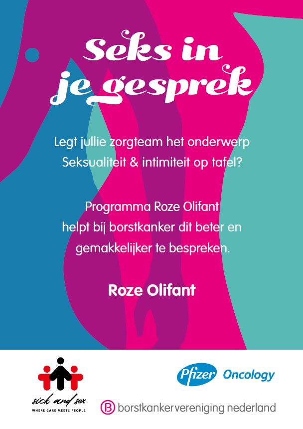 Begin 2018 bracht Borstkankervereniging Nederland (BVN) de brochure Seksualiteit en Intimiteit bij borstkanker uit. Er was direct grote vraag naar deze brochure. In vervolg hierop is een educatietraject gestart om zorgverleners beter uit te rusten voor een gesprek over seksualiteit. In november 2018 vond een expertmeeting plaats: “Seks in je gesprek – tot hoe ver reikt jouw expertise?” Verpleegkundigen/ verpleegkundig specialisten oncologie, oncologen en seksuologen kwamen bijeen om kennis op te doen en te delen. De best practices en wensen uit deze expertmeeting hebben geleid tot deze toolbox, die je kan ondersteunen om seksualiteit en intimiteit binnen je oncologisch zorgteam op de kaart te krijgen. Zo kunnen we de zorg voor borstkankerpatiënten verder verbeteren. De Roze Olifant is een samenwerkingsproject van de werkgroep Seks in je gesprek, gevormd door vertegenwoordigers van Borstkankervereniging Nederland (BVN), Sick and Sex, zorgverleners die passie hebben voor het onderwerp en Pfizer Oncology.