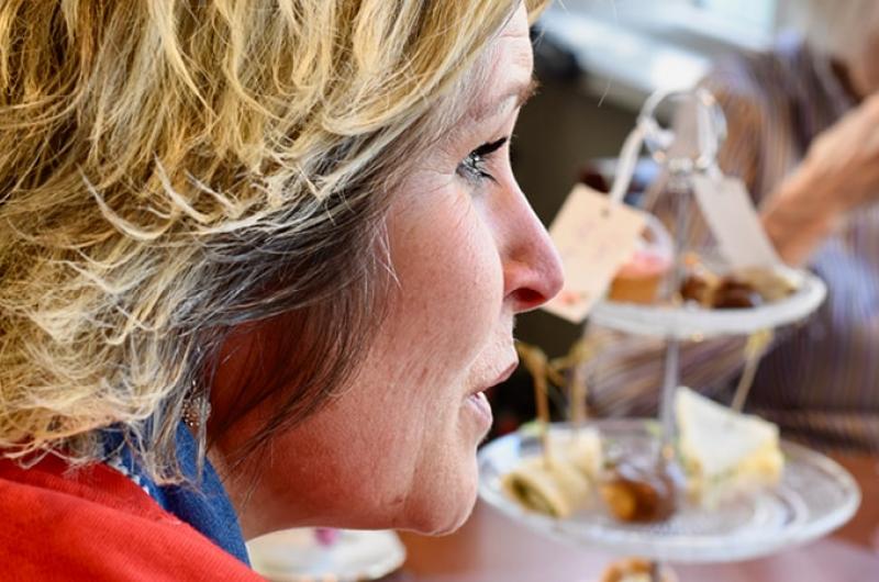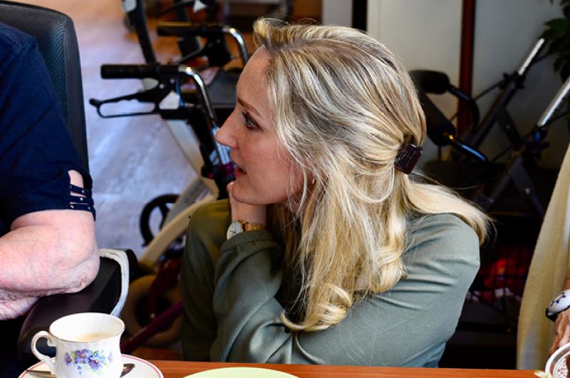 Terwijl de bewoners met volle teugen genieten van hun thee en alle lekkernijen, checkt Petra Macor, activiteitenbegeleider van Laurens Blijdorp, ondertussen bij alle tafels of alles goed loopt. Er zijn overal voldoende hapjes, maar heeft ook iedereen het naar zijn zin?