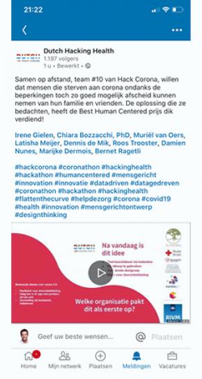 Wil je meer lezen over de hackaton kijk dan op de webite Dutchhackinghealth.nl/hackcorona. Hier vind je ook meer informatie over het project Samen op afstand, meeleven in tijden van corona (project #10) dat de Best Human Centered prijs won. Via deze link vind je het pitchfilmpje dat het Samen op Afstandteam maakte.