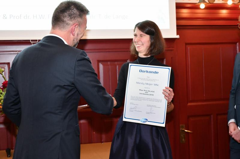 Marc Kaptein, medisch directeur van Pfizer Nederland, overhandigde de drie trotse winnaars hun prijs. “Het doet de jury en mij enorm veel plezier om te zien dat er dit jaar maar liefst 30 inzendingen waren. De jury stond voor de moeilijke taak om tot drie winnaars te komen. Alle drie hebben belangrijk onderzoek gedaan wat aan de basis kan staan van een medische doorbraak. Dit komt dan weer goed overeen met de missie van Pfizer, ‘doorbraken realiseren die de levens van patiënten veranderen’. Dat is dan ook waarom wij de Prijzen voor Life Sciences een warm hart toedragen.”