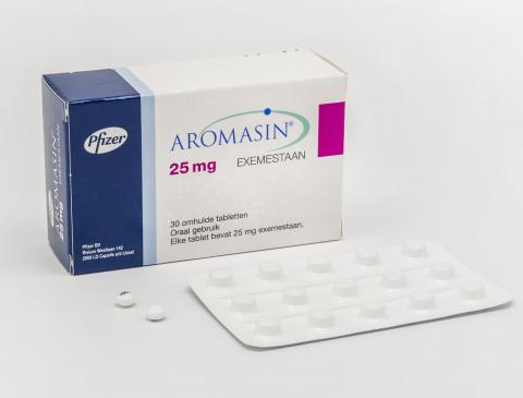Dit middel wordt Aromasin genoemd. Aromasin® behoort tot een groep medicijnen die bekend zijn als aromataseremmers. Deze middelen remmen het enzym aromatase dat nodig is bij de aanmaak van vrouwelijke geslachtshormonen, de oestrogenen. In het bijzonder bij vrouwen na de overgang wordt aromatase door Aromasin sterk geremd. Hierdoor wordt de hoeveelheid oestrogeen in het lichaam verlaagd. Dit is een manier om hormoongevoelige borstkanker te behandelen.