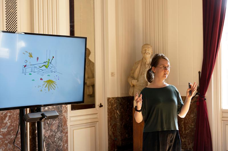 Medisch adviseur Manon kondigt mentee Annette aan. ’’Annette stelt veel kritische vragen en heeft een goede pitch voorbereid’’, belooft Manon aan de zaal.