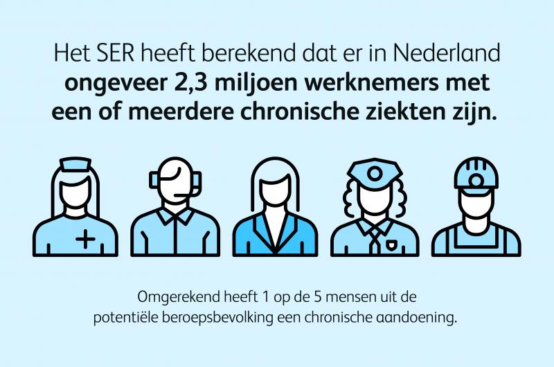 De Sociaal-Economische Raad (SER) heeft berekend dat binnen de beroepsbevolking het aantal mensen met een chronische ziekte uitkomt op 2,3 miljoen. Dat betekent dat ongeveer een op de vijf mensen binnen de potentiële beroepsbevolking een chronische ziekte heeft.