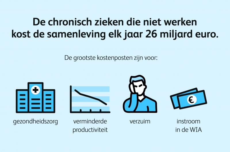 Zo'n 9,9 miljoen Nederlanders hebben een of meer chronische ziekten, uiteenlopend van diabetes en reuma tot lage rugpijn en migraine. Omgerekend praten we over 58 procent van de Nederlandse bevolking. De verwachting is dat het aantal mensen met een chronische ziekte blijft groeien. Wat kan de overheid doen om hen (deels) te laten blijven werken? Want werk kan ook een medicijn zijn.