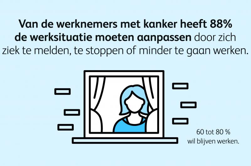 Voor het overgrote deel van de mensen met kanker (88 procent) verandert de werksituatie. Ze melden zich voor korte of langere tijd ziek, gaan minder werken of moeten stoppen met werken. Van de mensen met kanker verliest een op de tien mensen zijn baan vanwege de ziekte of de behandeling.