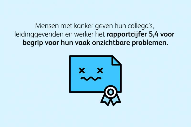 Bij de mensen met kanker ligt dit anders. Collega’s, leidinggevenden en werkgevers krijgen van hen het rapportcijfer 5,4 voor begrip voor de late gevolgen van kanker, zoals vermoeidheid, concentratieproblemen en psychische klachten: klachten die van buitenaf minder zichtbaar zijn.